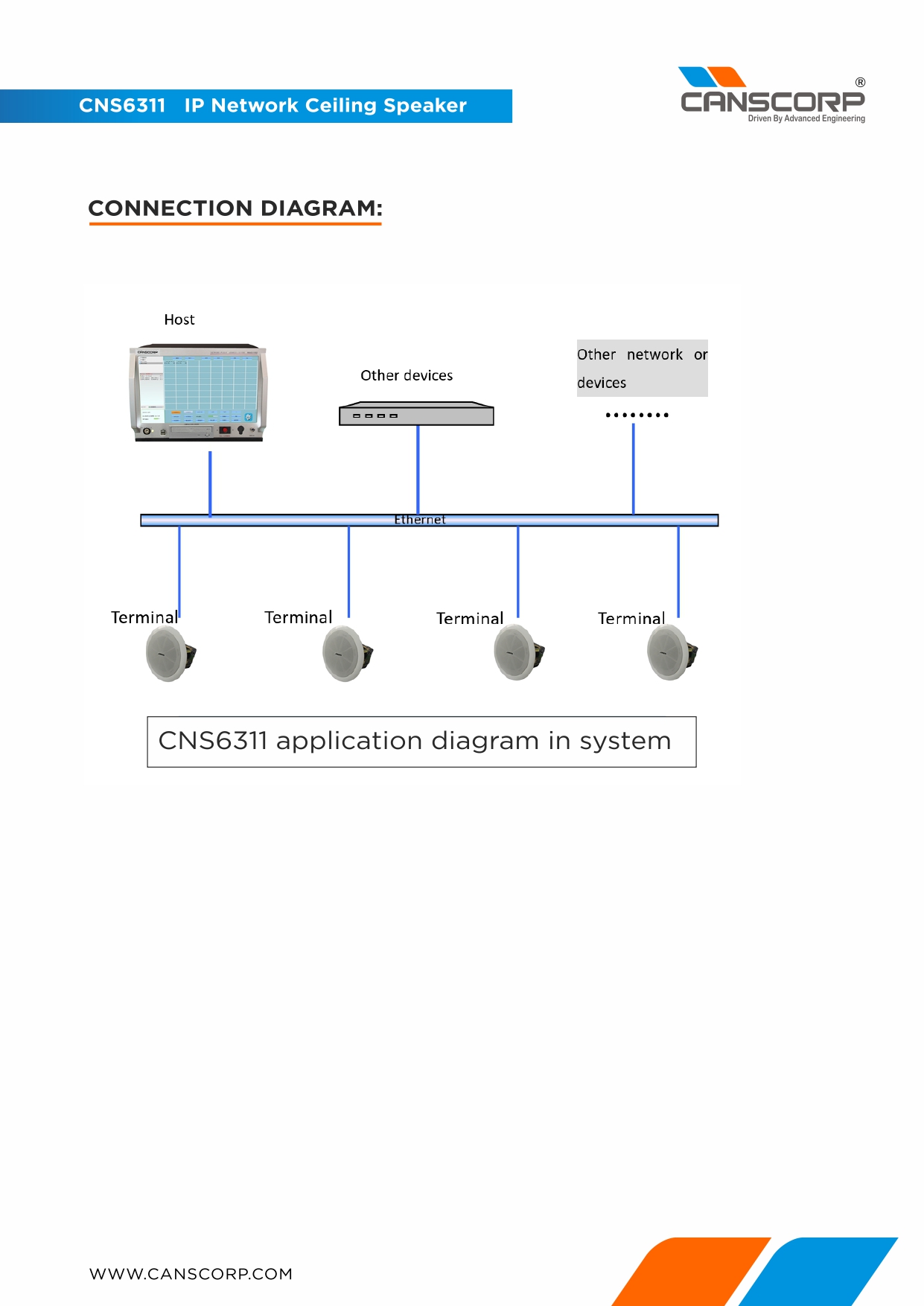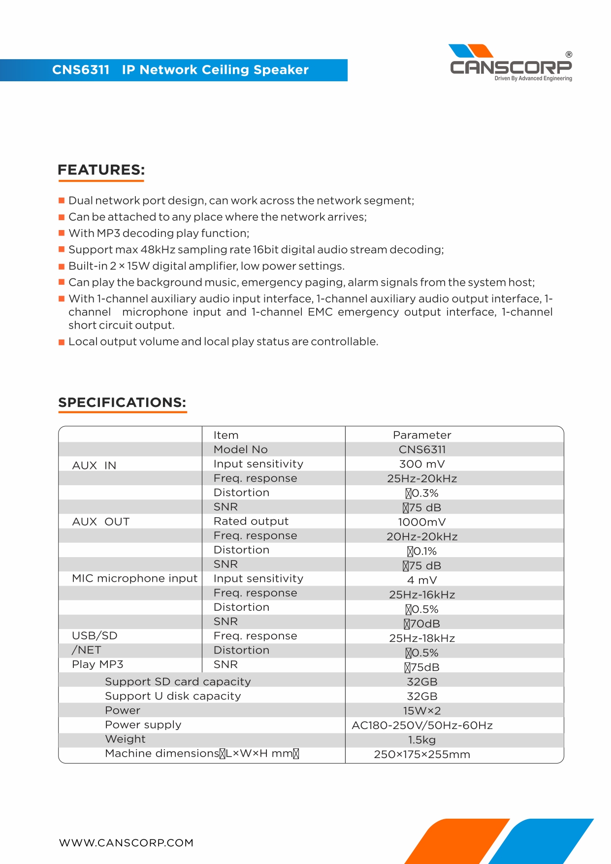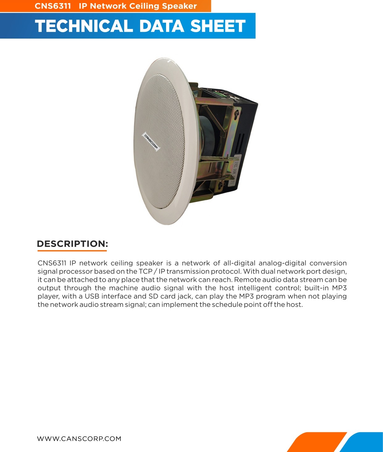 CNS6311 IP network ceiling speaker is a network of all-digital analog-digital conversion signal processor based on the TCP/IP transmission protocol. With dual network port design, it can be attached to any place that the network can reach. Remote audio data stream can be output through the machine audio signal with the host intelligent control; built-in MP3 player, with a USB interface and SD card jack, can play the MP3 program when not playing the network audio stream signal; can implement the schedule point off the host.