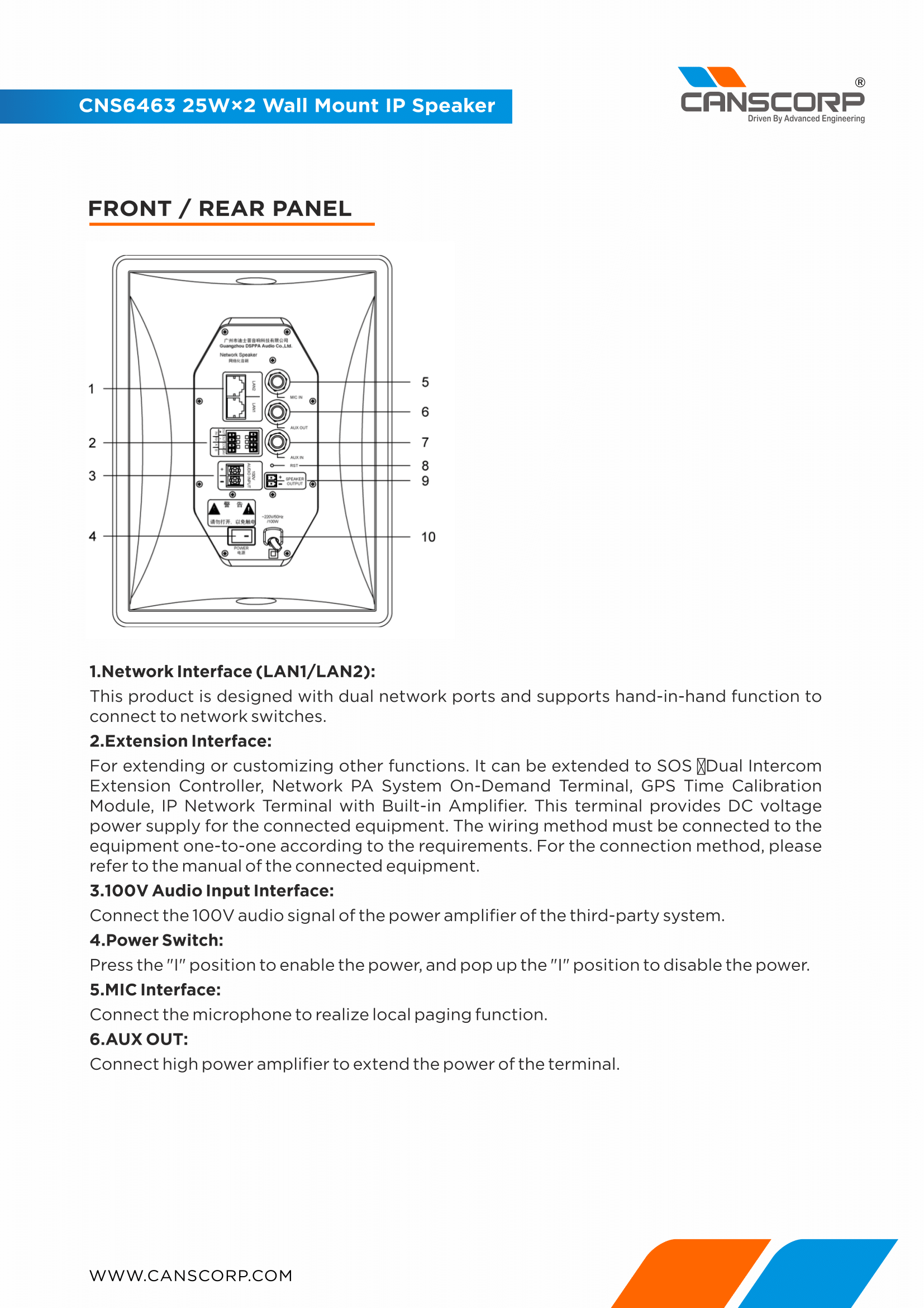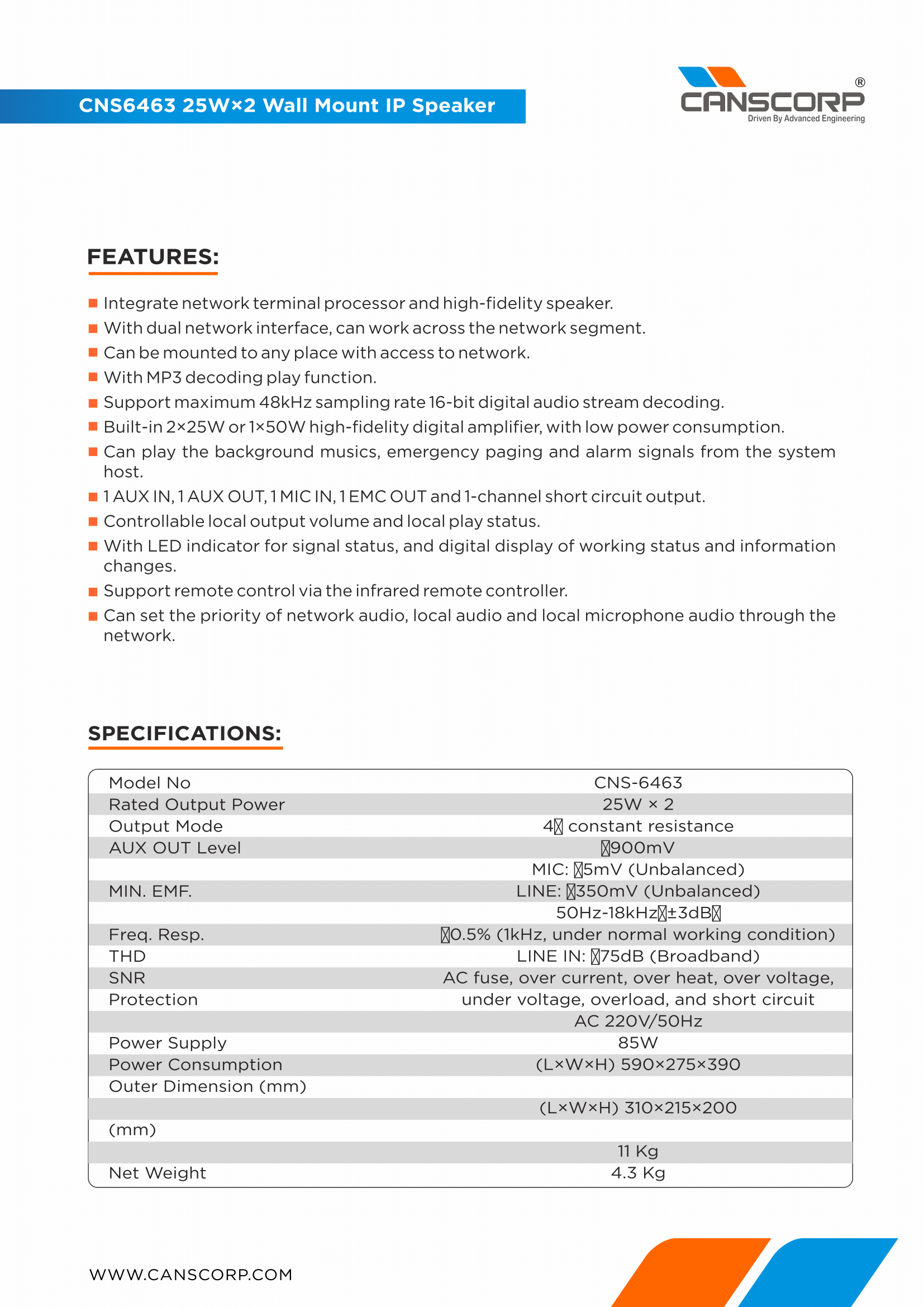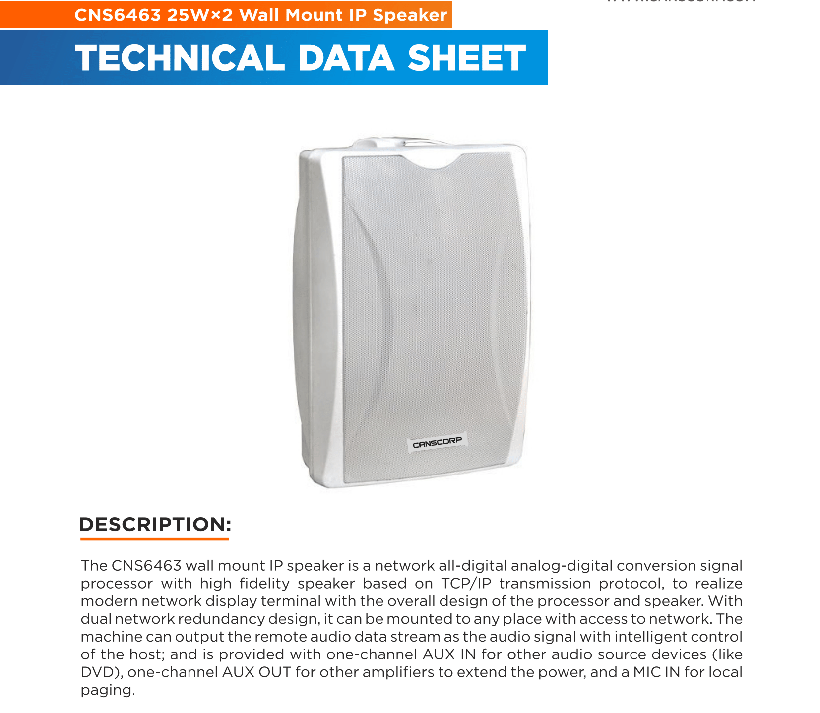 The CNS6463 wall mount IP speaker is a network all-digital analog-digital conversion signal processor with high fidelity speaker based on TCP/IP transmission protocol, to realize modern network display terminal with the overall design of the processor and speaker. With dual network redundancy design, it can be mounted to any place with access to network. The machine can output the remote audio data stream as the audio signal with intelligent control of the host; and is provided with one-channel AUX IN for other audio source devices (like DVD), one-channel AUX OUT for other amplifiers to extend the power, and a MIC IN for local paging.